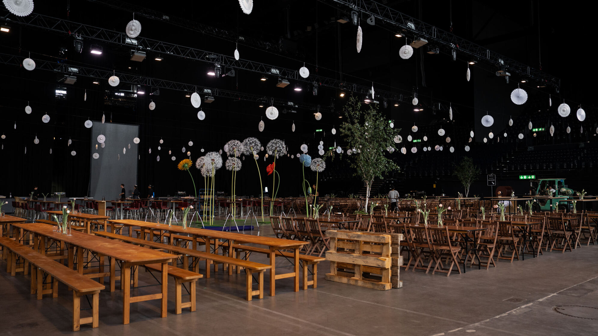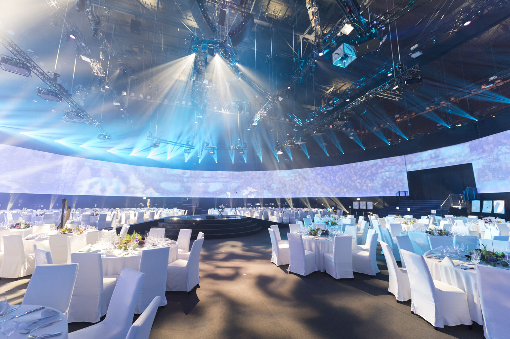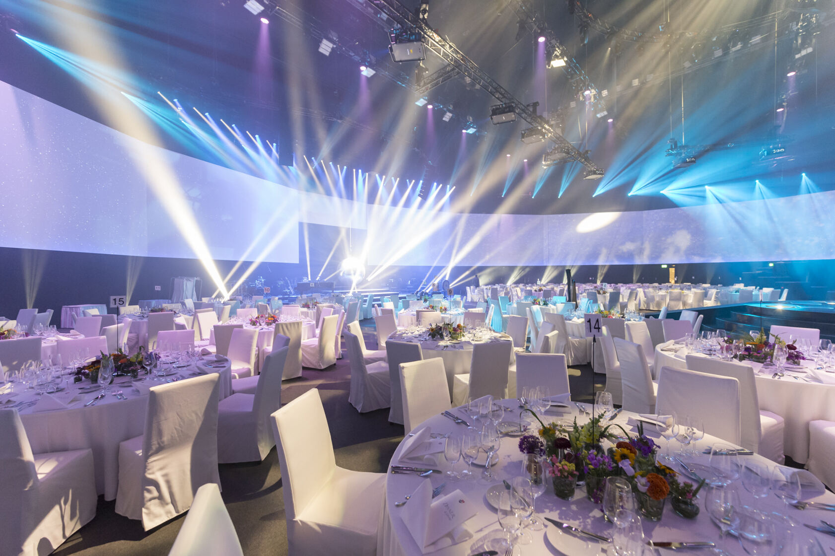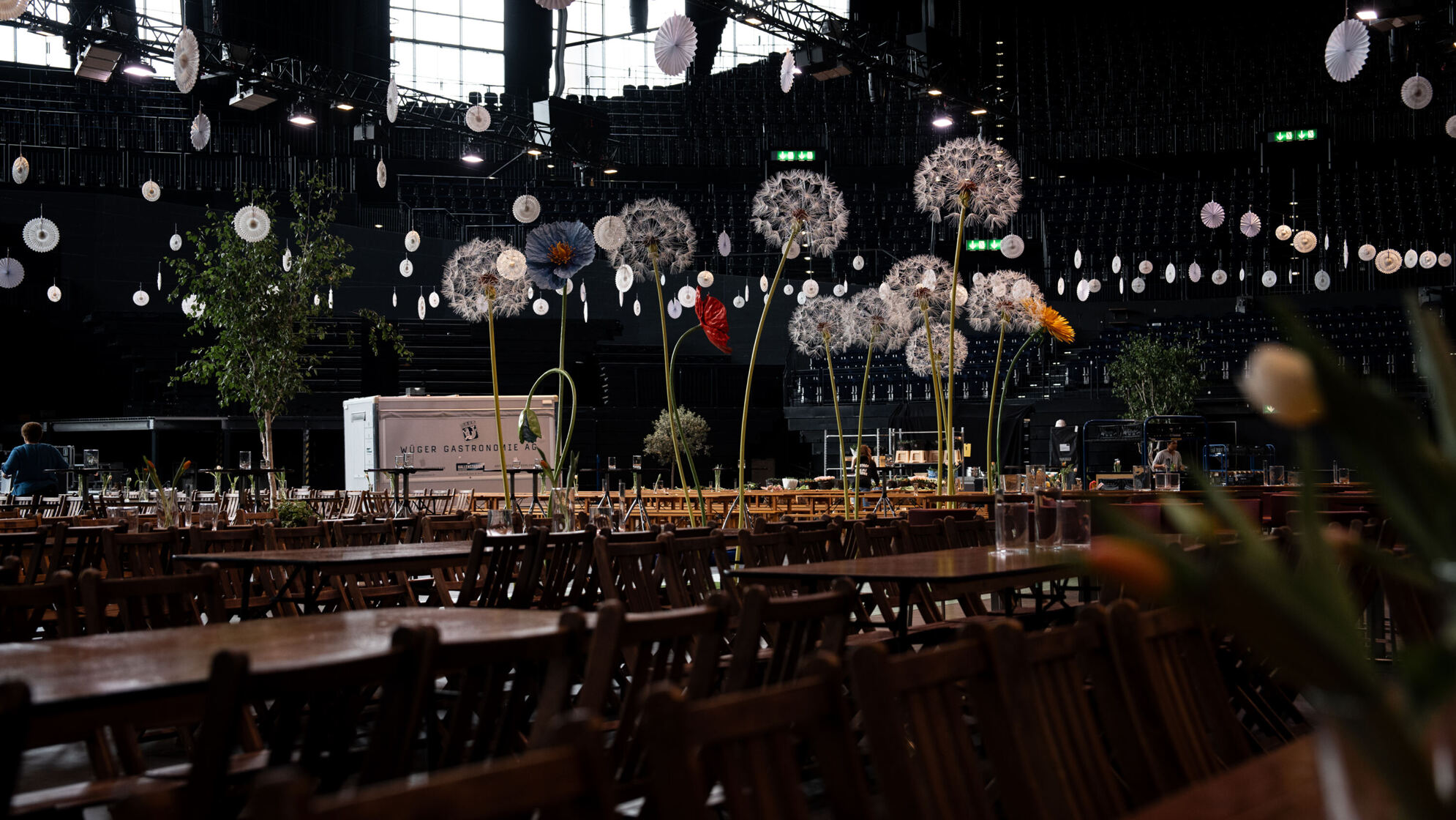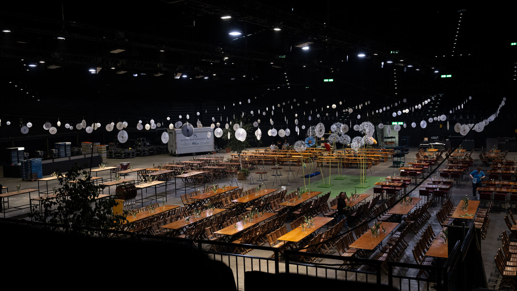 Bei diesem Layout wird die Halle unterteilt, sodass zwei klar abgegrenzte Bereiche entstehen. Diese können unabhängig voneinander oder kombiniert genutzt werden – zum Beispiel für unterschiedliche Programmteile, Cateringzonen oder Breakout-Flächen. Ideal für modulare Konzepte mit klarer Struktur und viel Gestaltungsfreiraum.