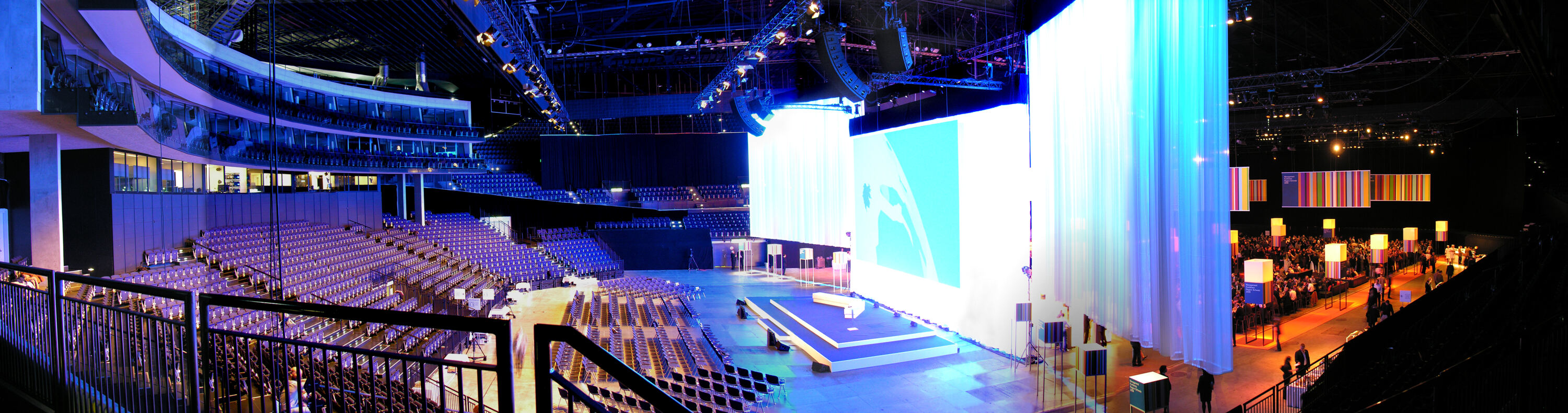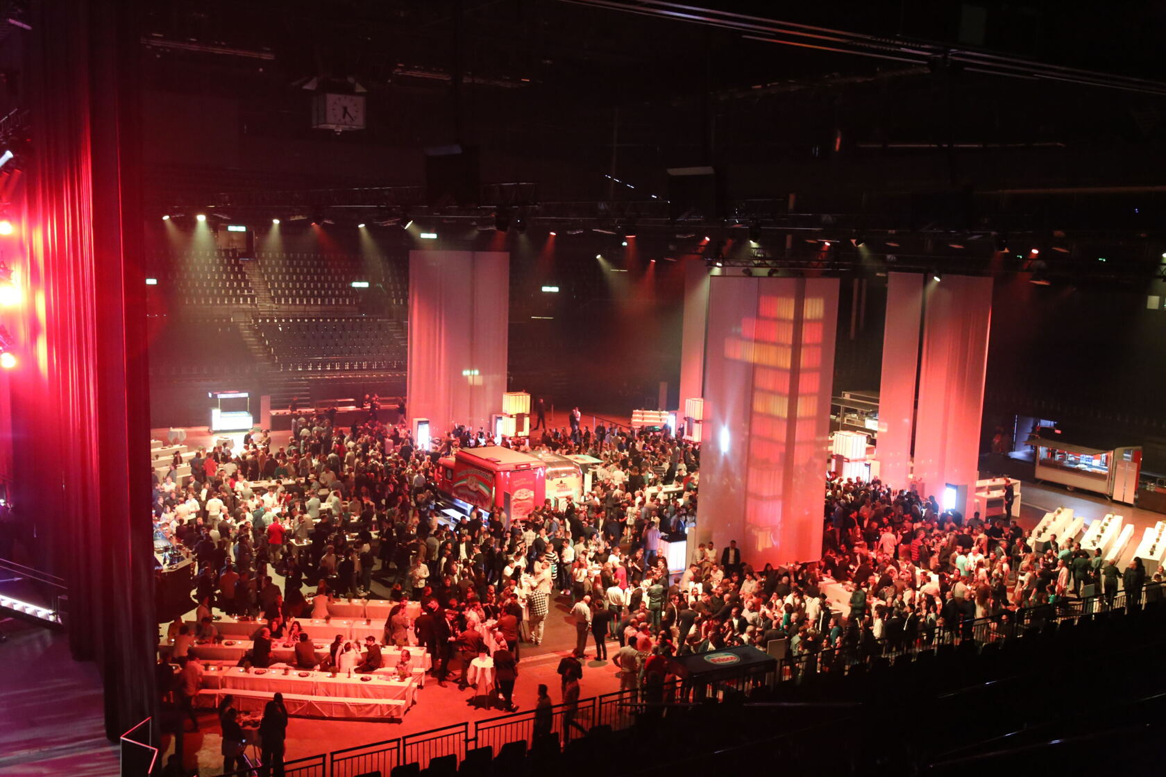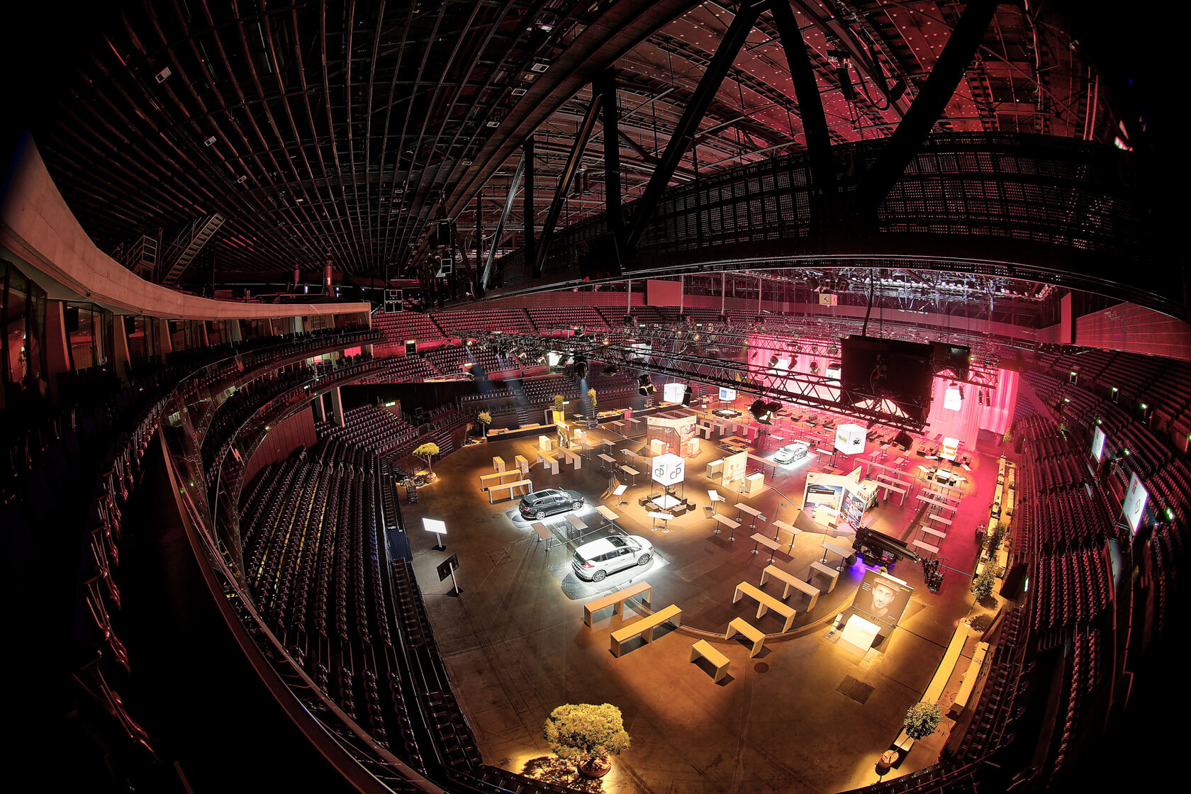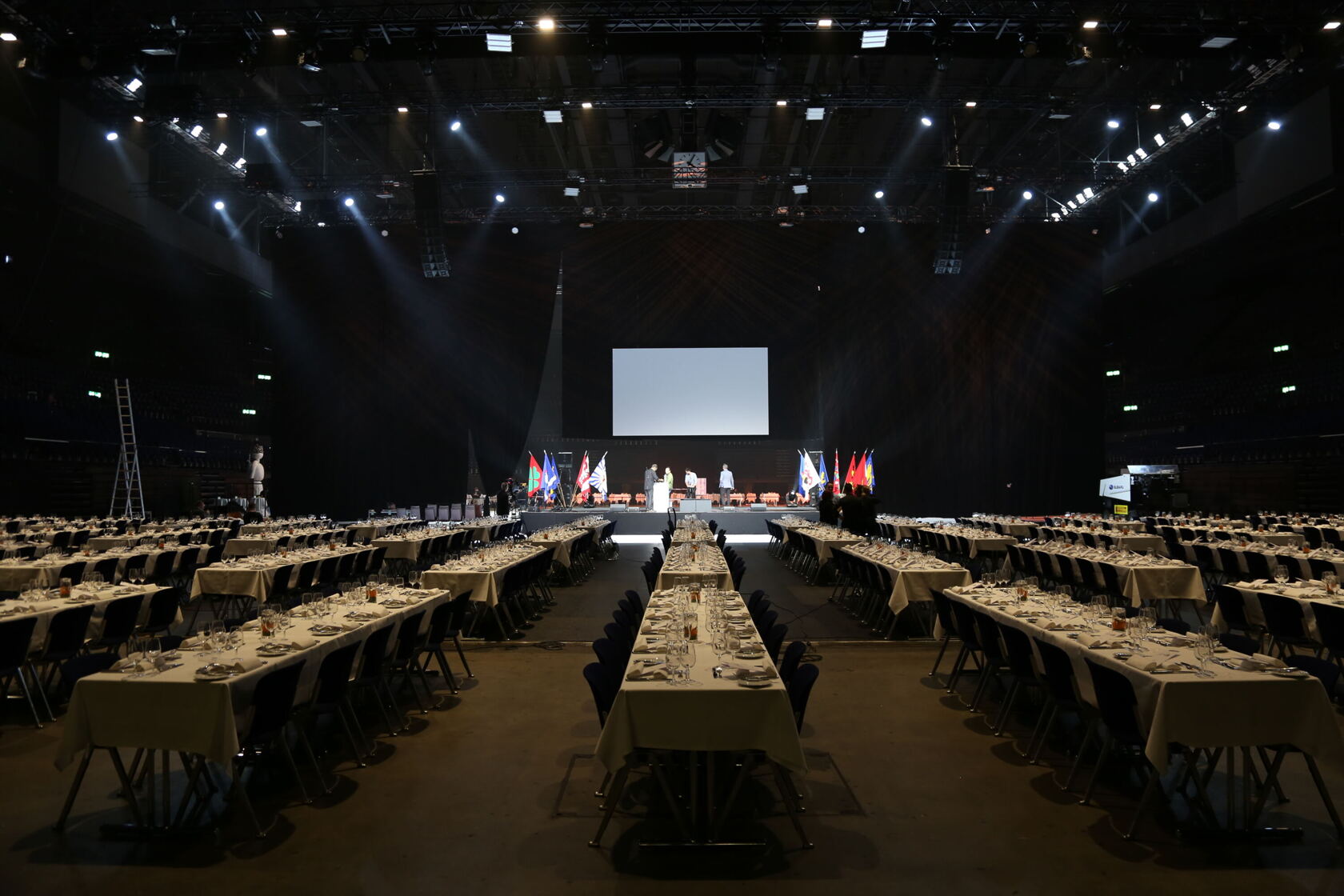 Bei diesem Layout wird die Halle unterteilt, sodass zwei klar abgegrenzte Bereiche entstehen. Diese können unabhängig voneinander oder kombiniert genutzt werden – zum Beispiel für unterschiedliche Programmteile, Cateringzonen oder Breakout-Flächen. Ideal für modulare Konzepte mit klarer Struktur und viel Gestaltungsfreiraum.