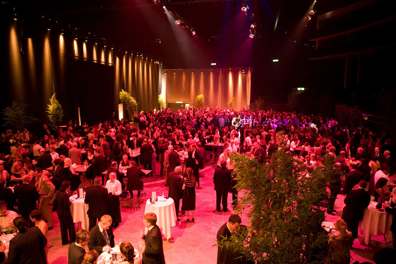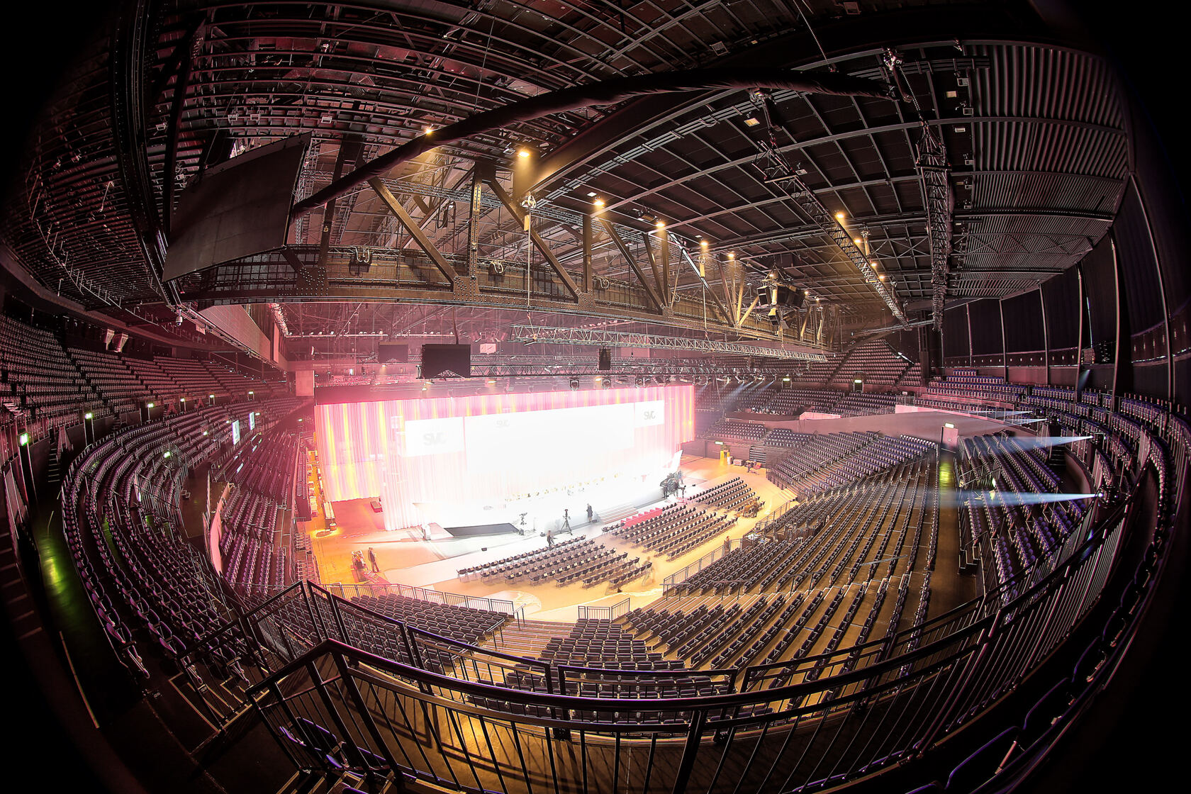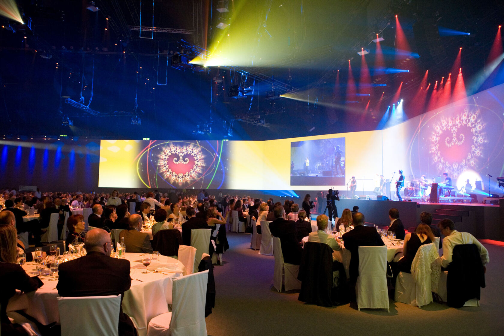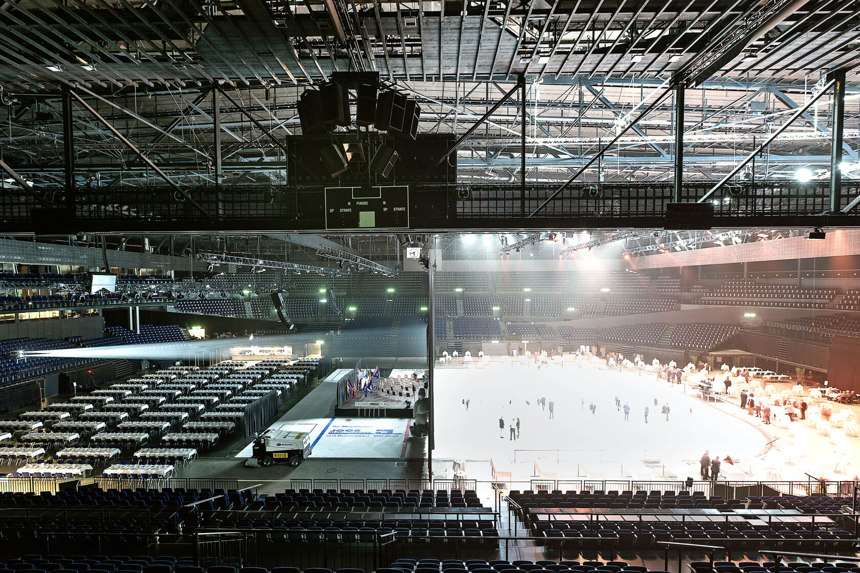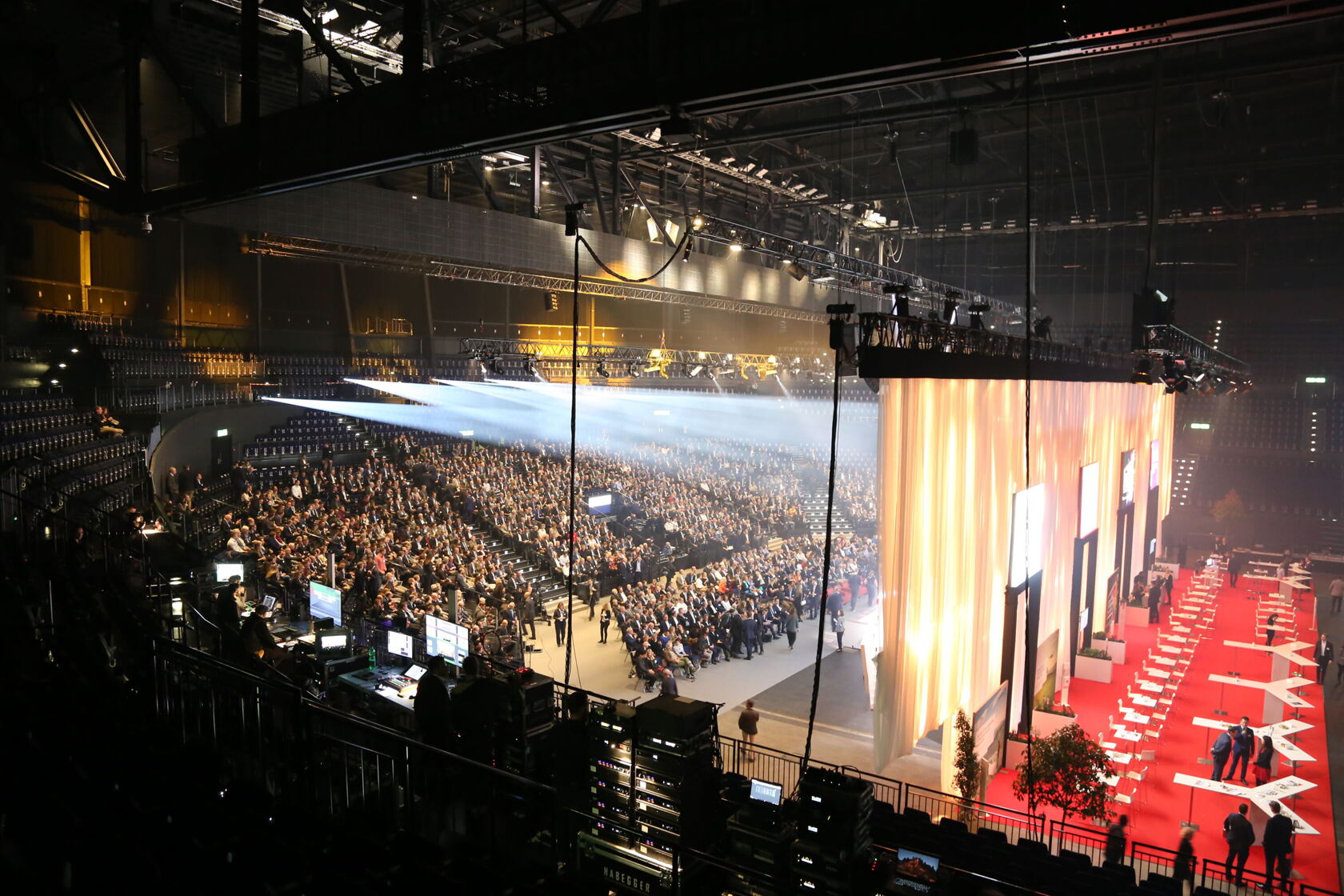 Bei diesem Layout wird die Halle unterteilt, sodass zwei klar abgegrenzte Bereiche entstehen. Diese können unabhängig voneinander oder kombiniert genutzt werden – zum Beispiel für unterschiedliche Programmteile, Cateringzonen oder Breakout-Flächen. Ideal für modulare Konzepte mit klarer Struktur und viel Gestaltungsfreiraum.