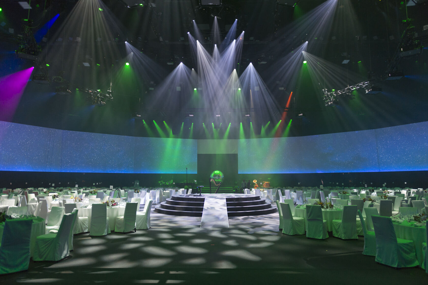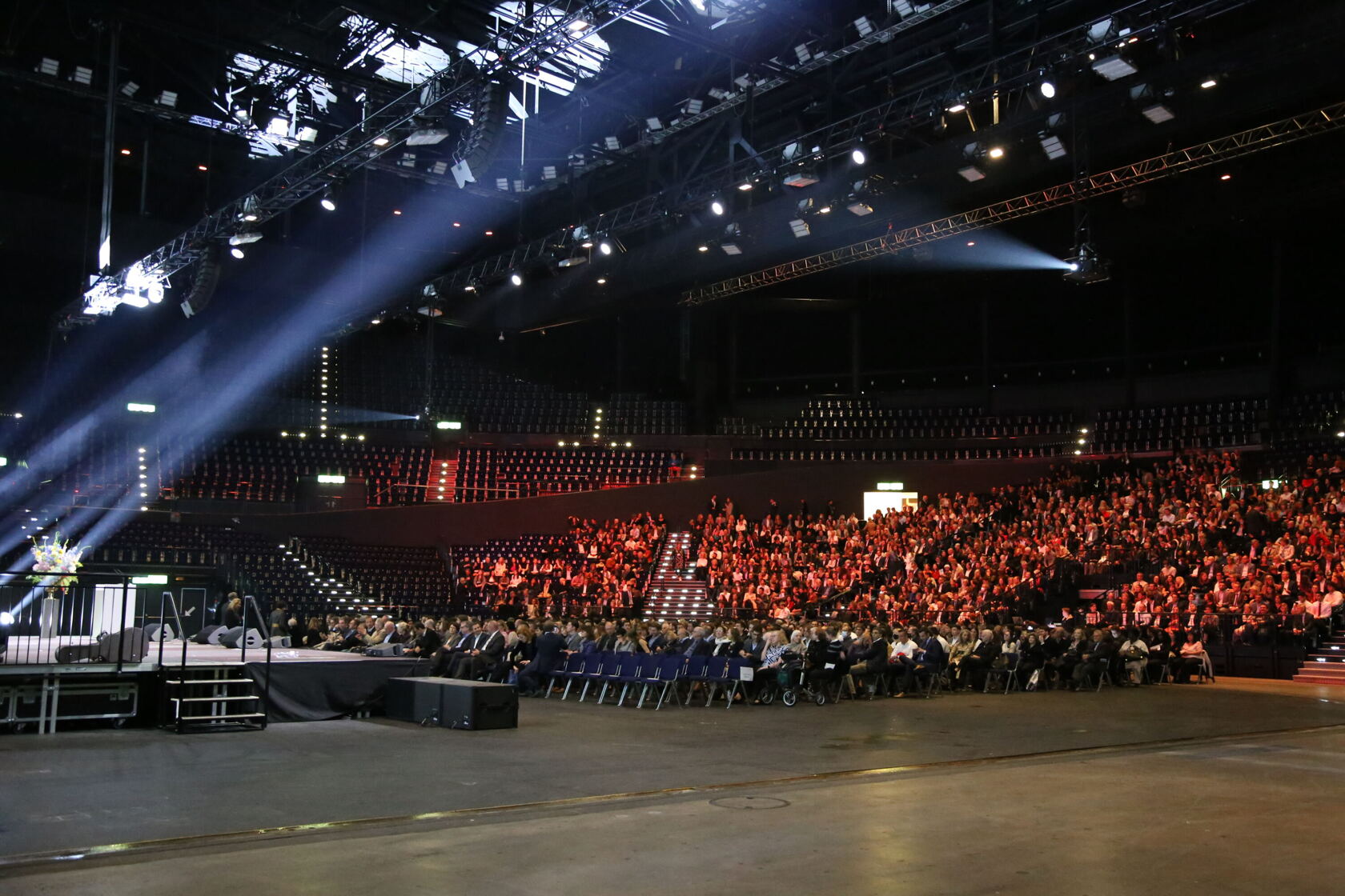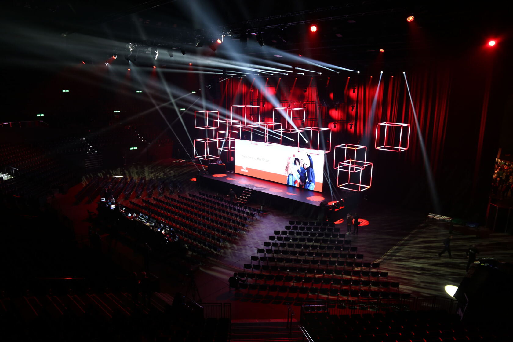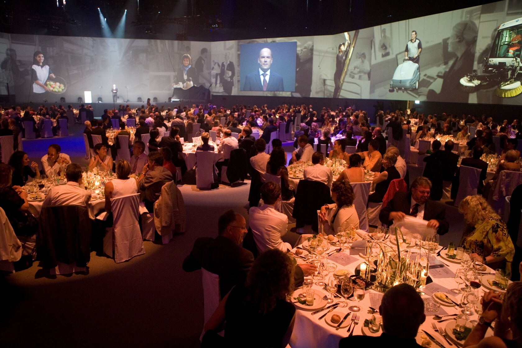 Bei diesem Layout wird die Halle unterteilt, sodass zwei klar abgegrenzte Bereiche entstehen. Diese können unabhängig voneinander oder kombiniert genutzt werden – zum Beispiel für unterschiedliche Programmteile, Cateringzonen oder Breakout-Flächen. Ideal für modulare Konzepte mit klarer Struktur und viel Gestaltungsfreiraum.