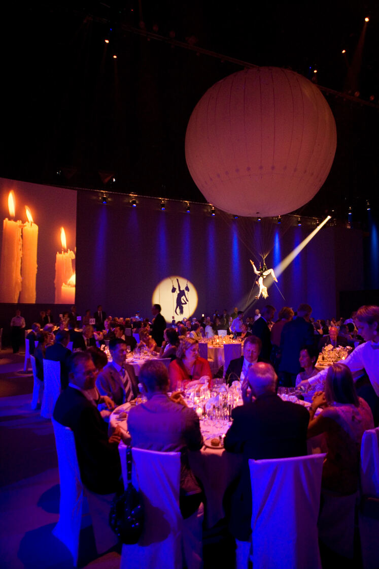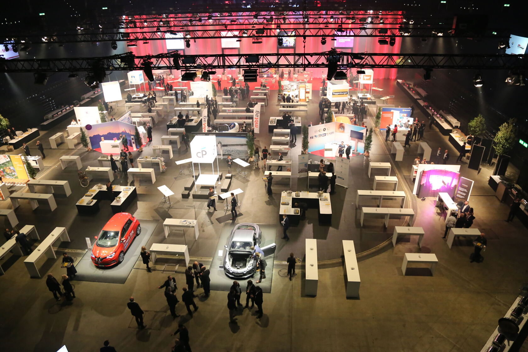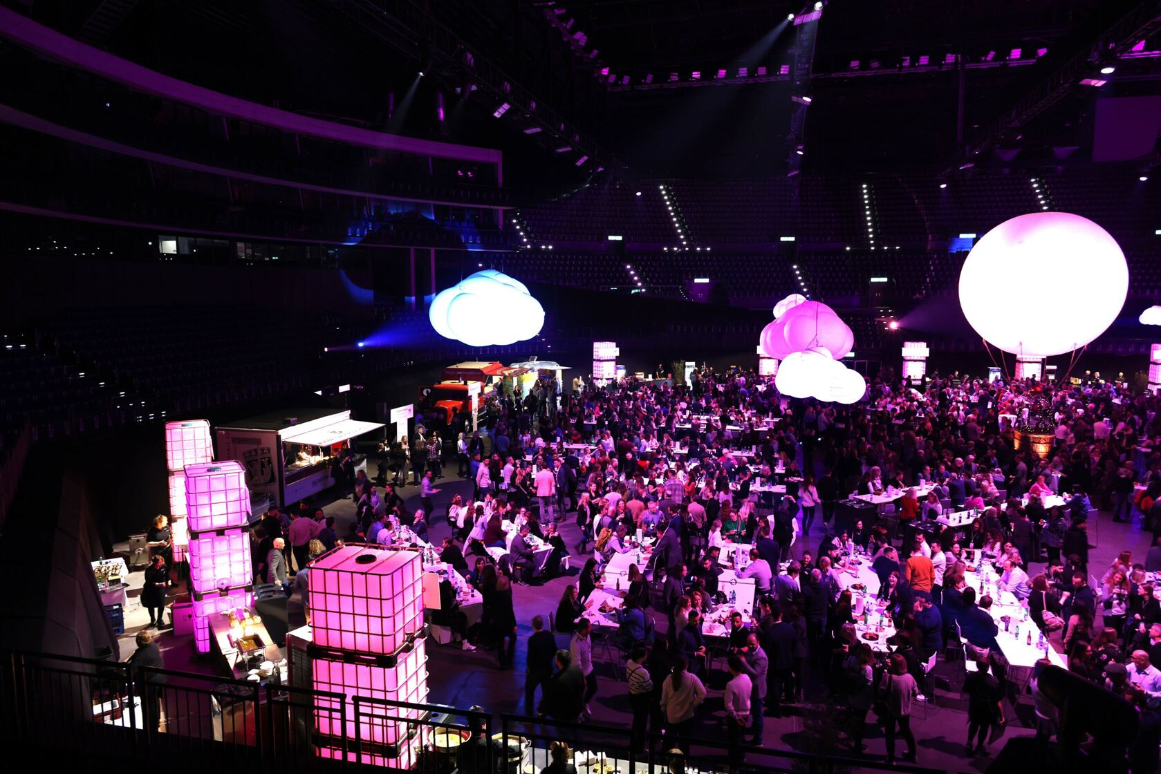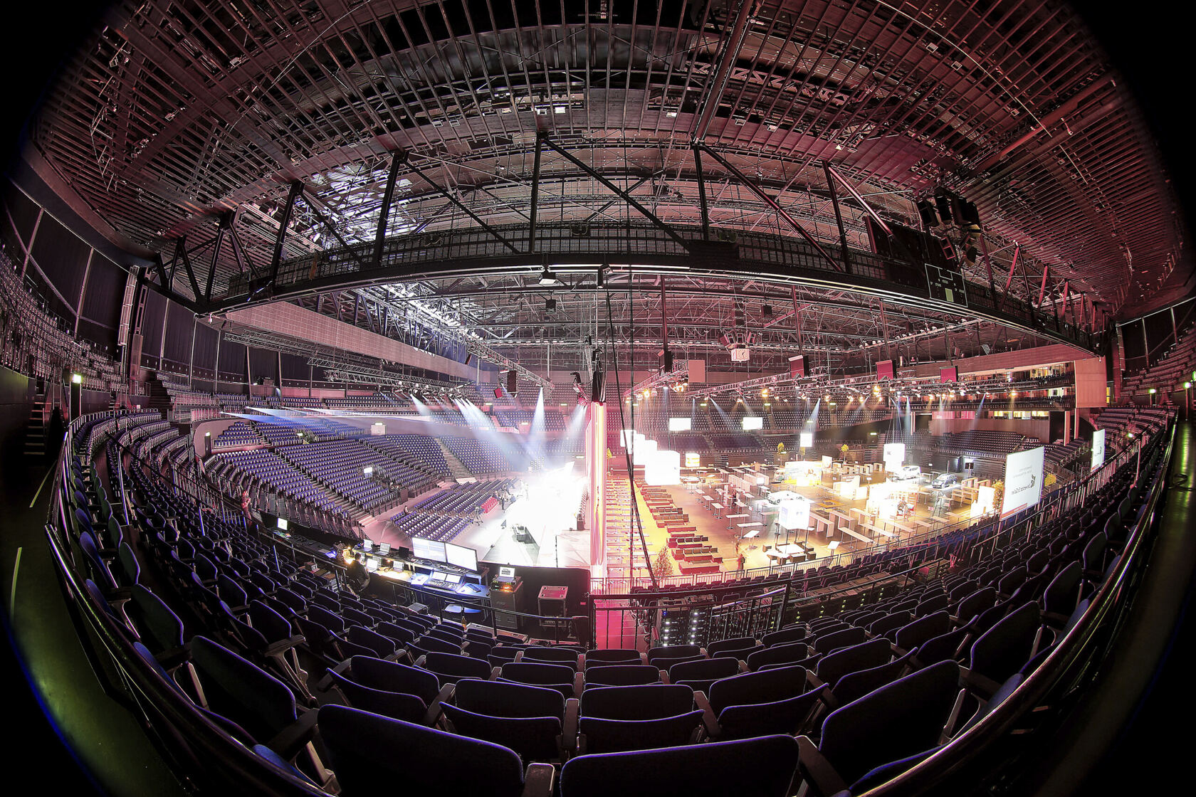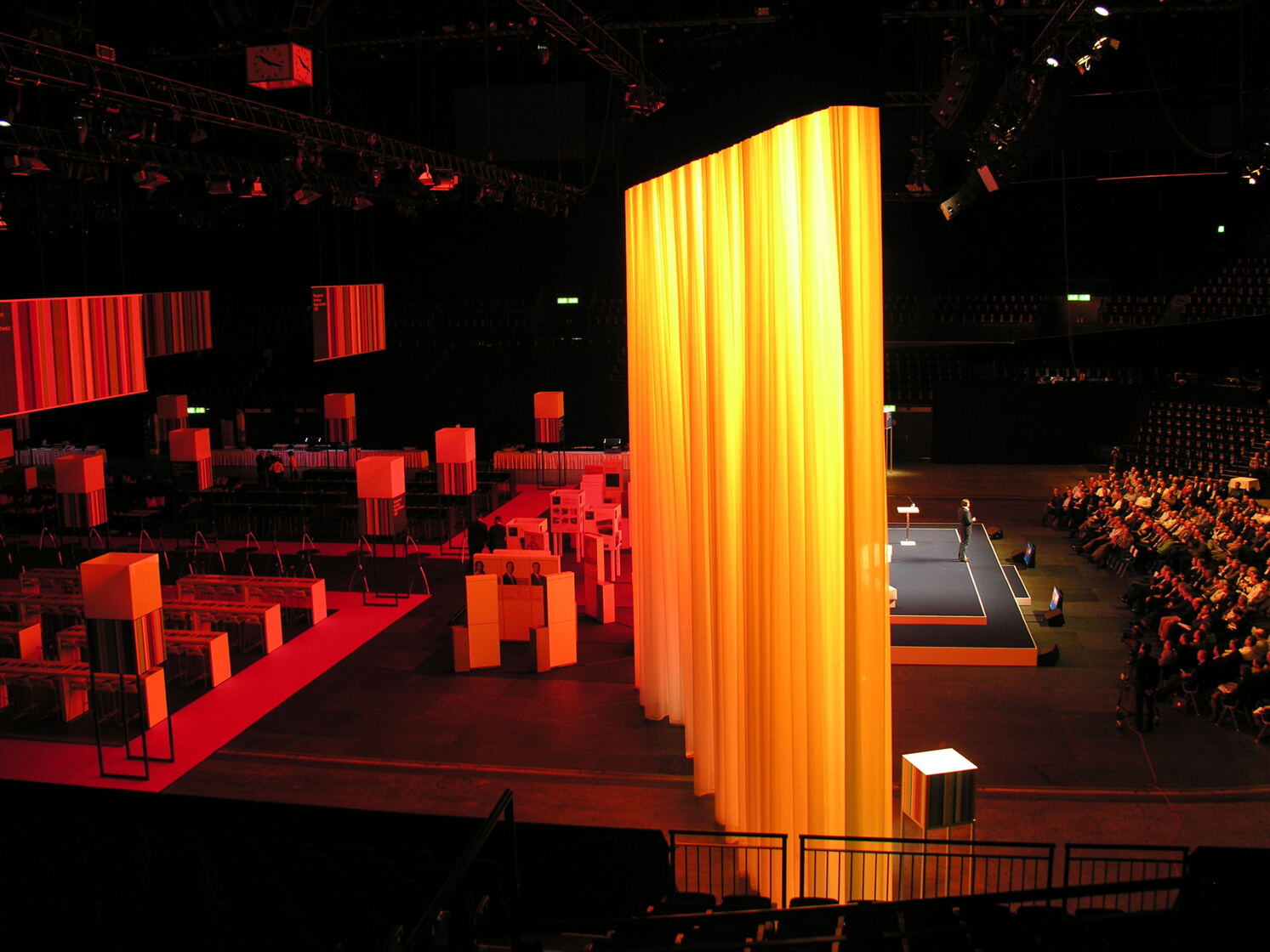 Bei diesem Layout wird die Halle unterteilt, sodass zwei klar abgegrenzte Bereiche entstehen. Diese können unabhängig voneinander oder kombiniert genutzt werden – zum Beispiel für unterschiedliche Programmteile, Cateringzonen oder Breakout-Flächen. Ideal für modulare Konzepte mit klarer Struktur und viel Gestaltungsfreiraum.