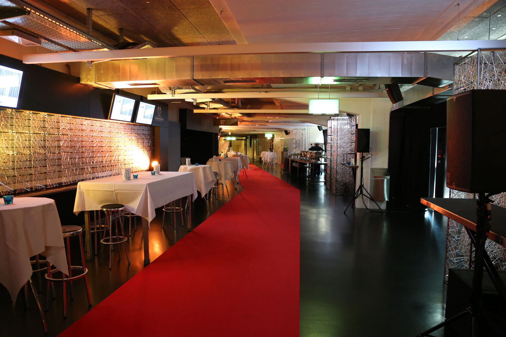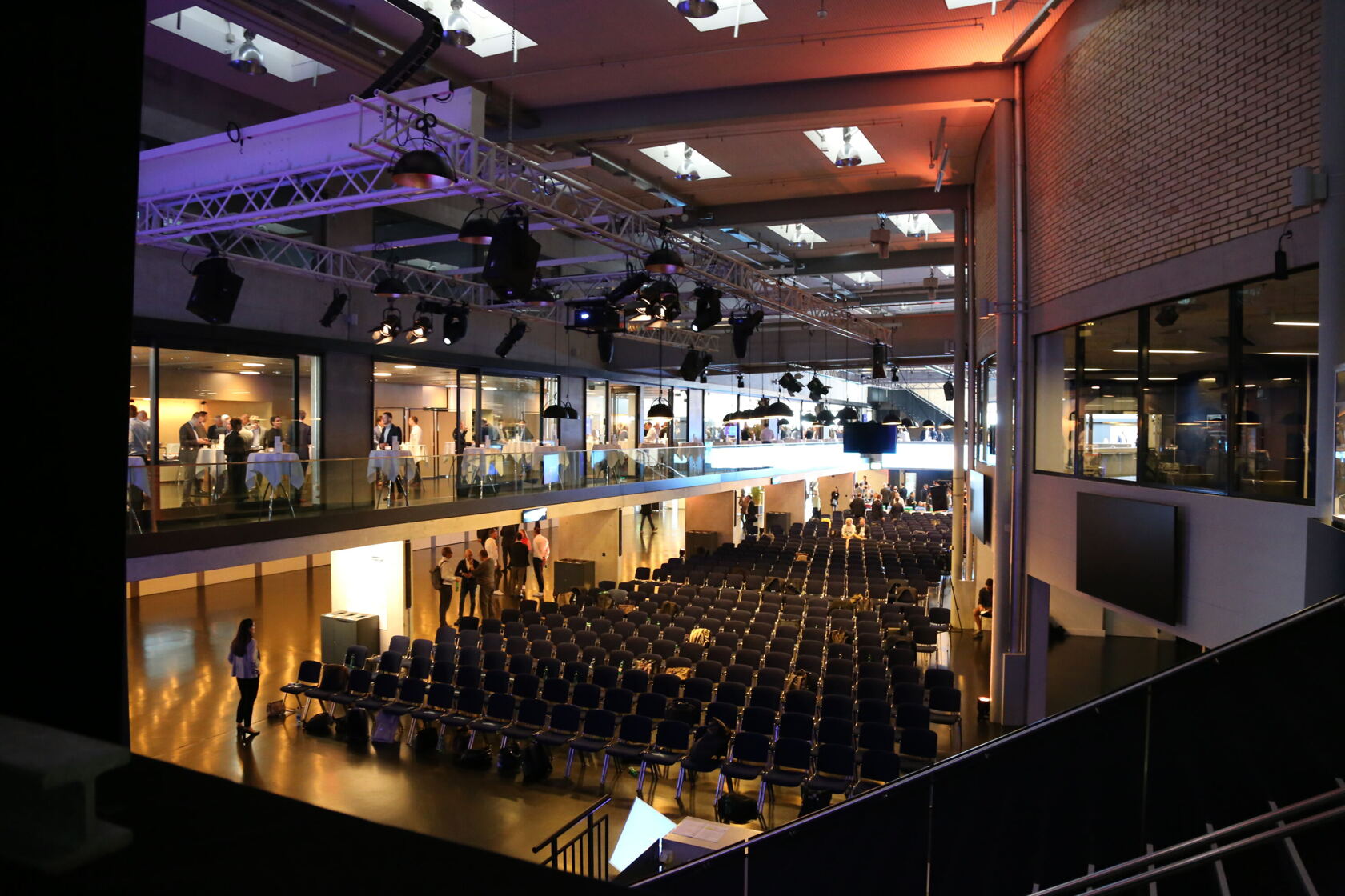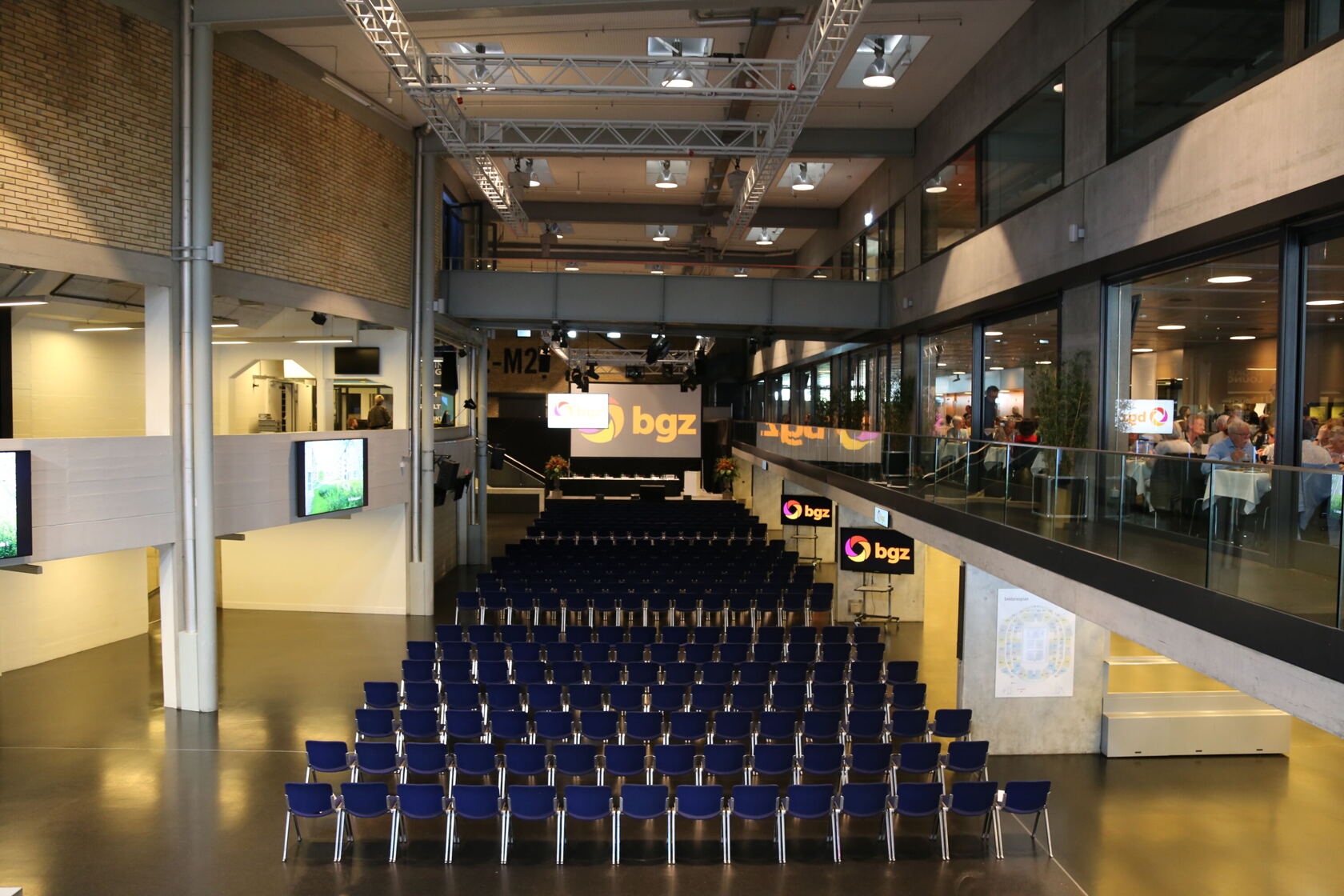 Das Summit Layout im Foyer schafft den passenden Rahmen für Keynotes, Panels oder Impulsvorträge. Bühne, Reihenbestuhlung und Networking-Zonen lassen sich flexibel kombinieren – ideal für Formate mit Fokus, Austausch und professioneller Atmosphäre.