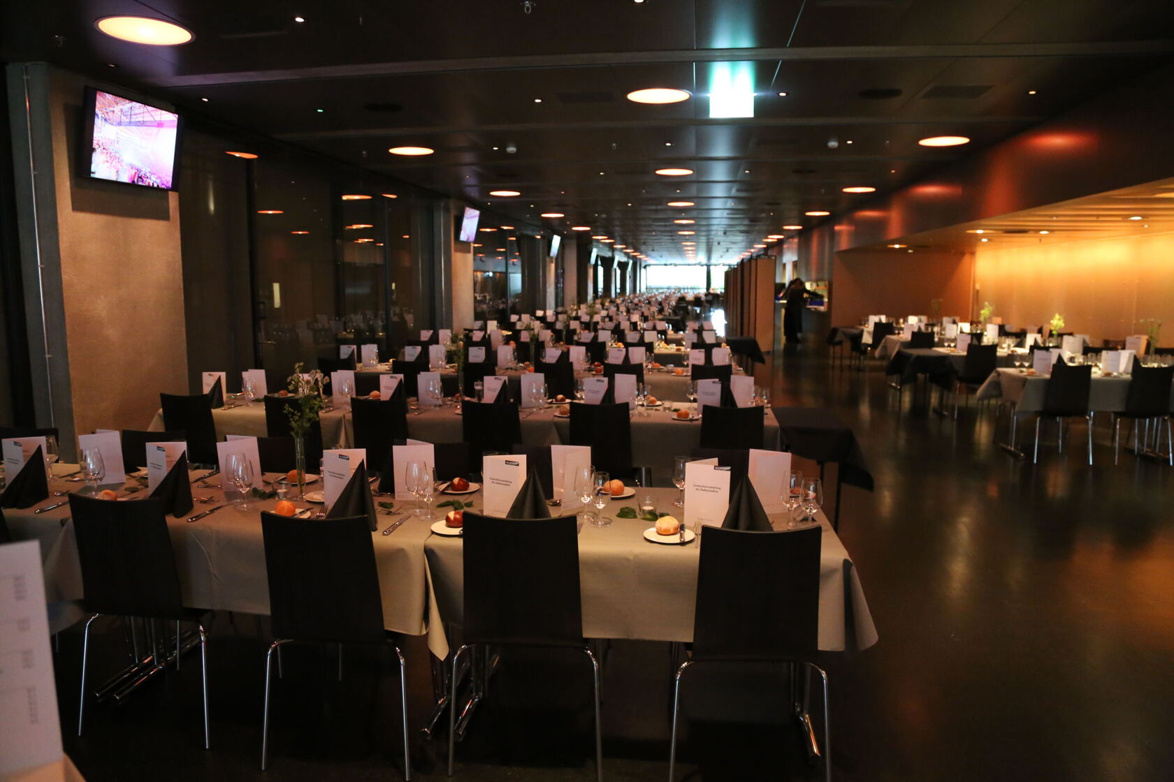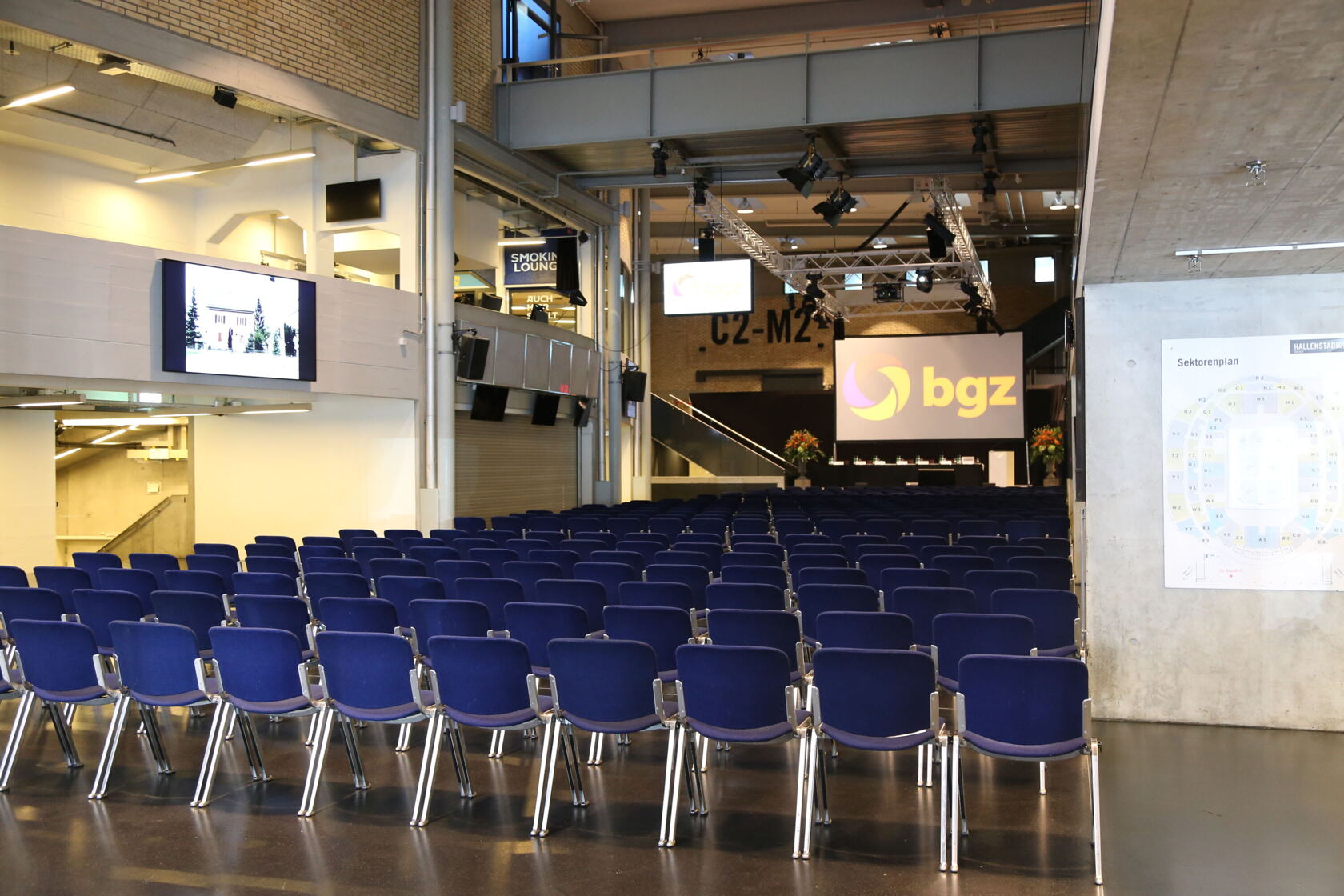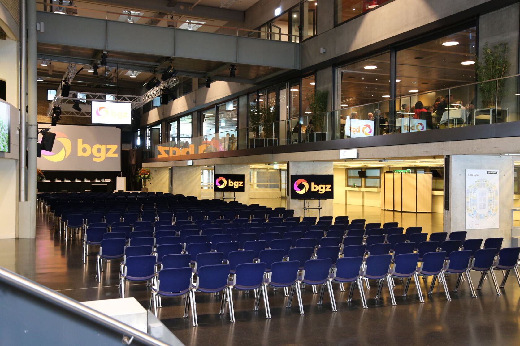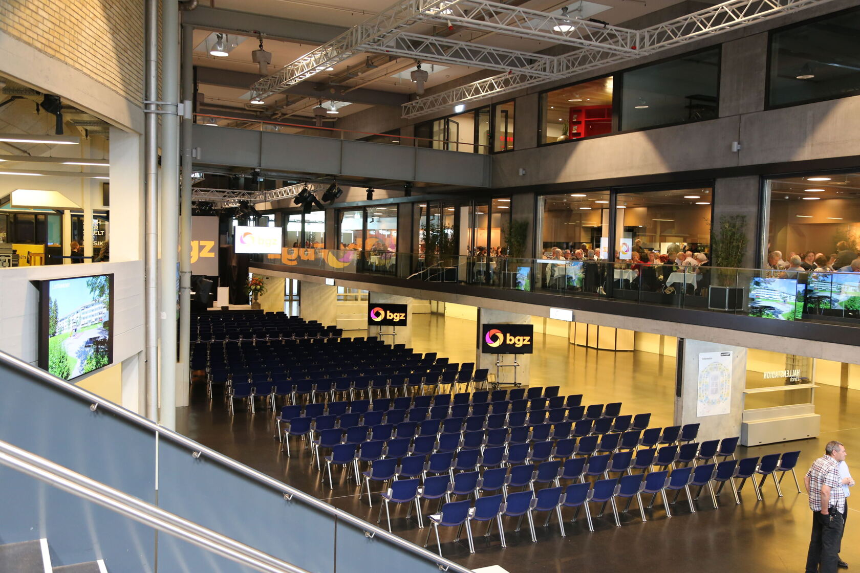 Das Summit Layout im Foyer schafft den passenden Rahmen für Keynotes, Panels oder Impulsvorträge. Bühne, Reihenbestuhlung und Networking-Zonen lassen sich flexibel kombinieren – ideal für Formate mit Fokus, Austausch und professioneller Atmosphäre.